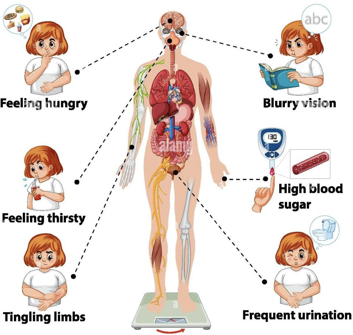 High glucose can damage the blood vessels that supply nutrients to your nerves. When your nerves don’t receive enough oxygen and nutrients, they cannot function properly. This is called diabetic neuropathy and is most common in your extremities (Hands and Legs).